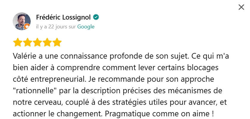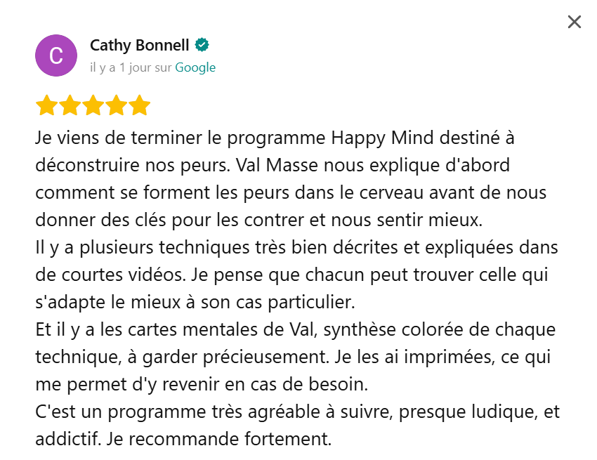 La formation proposée par Val Masse est à la fois très intéressante et ludique. les vidéos et les cartes mentales nous permettent de comprendre les fonctionnements de notre cerveau et de nous aider à faire émerger les croyances qui sont nos sources de blocages. Les techniques proposées pour débloquer nos peurs sont bluffantes d'efficacité. Je conseille totalement cette formation à qui souhaite travailler sur soi pour devenir réellement libre et serein ! J'ajoute que le sourire, l'humour et la voix douce de notre intervenante rendent l'expérience encore plus sympathique.