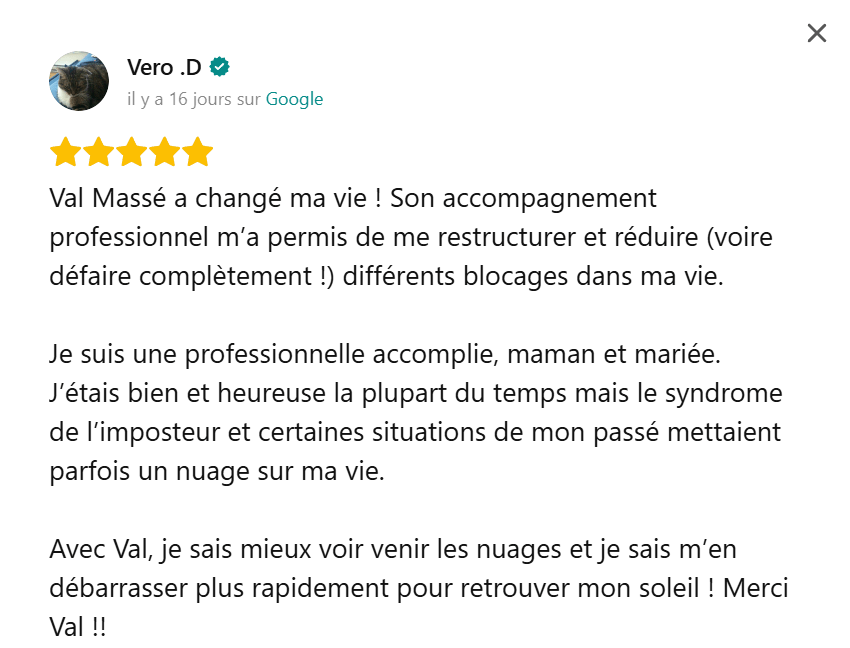 Si vous traversez une période difficile, je vous conseille vivement de prendre contact avec Val Masse. À un moment où j’étais submergée par des doutes et des angoisses, elle m’a accompagnée avec bienveillance et professionnalisme. Grâce à ses conseils pratiques et à sa compréhension des neurosciences, j’ai pu mieux comprendre mes émotions et les gérer au quotidien.