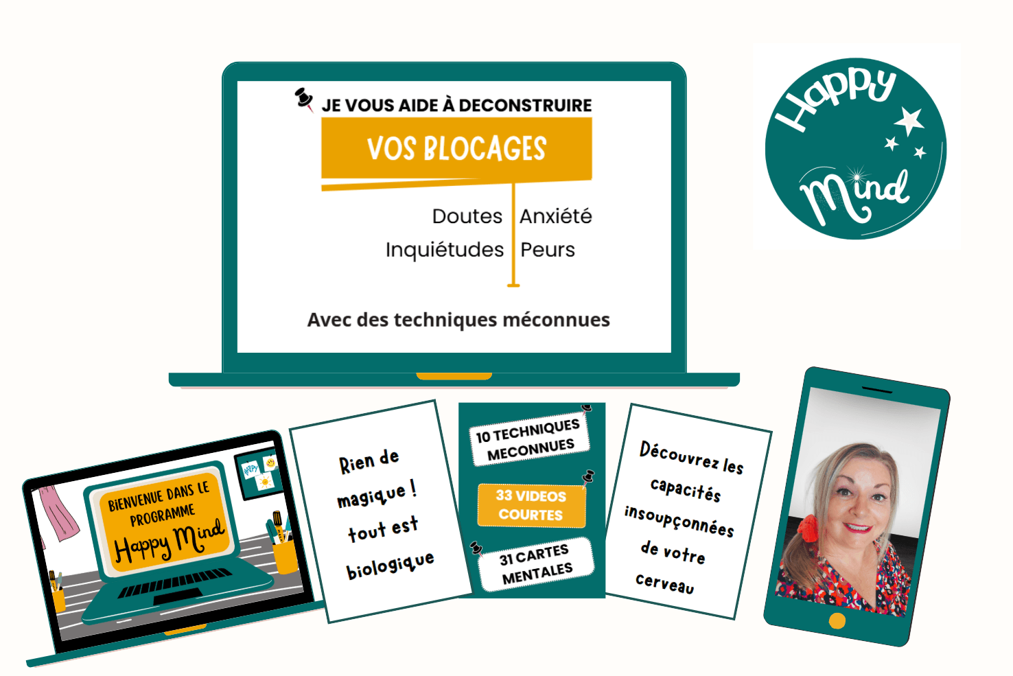 La formation Happy Mind est une boîte à outils remplie de techniques simples pour transformer votre quotidien. Que ce soit pour surmonter vos peurs, apaiser vos pensées, réduire l'intensité des émotions négatives ou cultiver des émotions agréables et bénéfiques, vous apprendrez à utiliser ces outils pour vous sentir mieux, avancer sereinement dans vos projets et vivre en harmonie avec vous-même. C'est une démarche complète qui vise à rééquilibrer vos émotions tout en favorisant votre bien-être et votre épanouissement personnel et professionnel 🙂